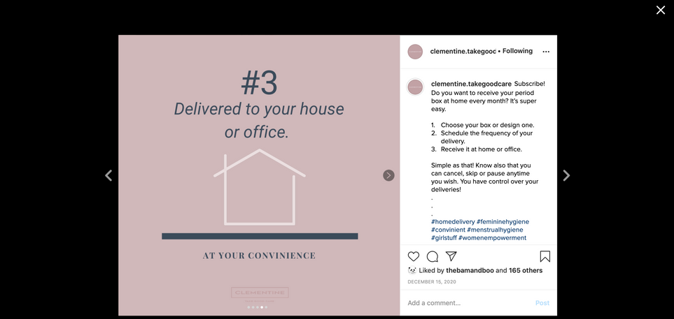 Clementine is a company devoted to making the world healthier, along with safer products people can trust. Their focus is on 100% biodegradable organic cotton tampons and eco-friendly pads which can be delivered to one's door every month.
